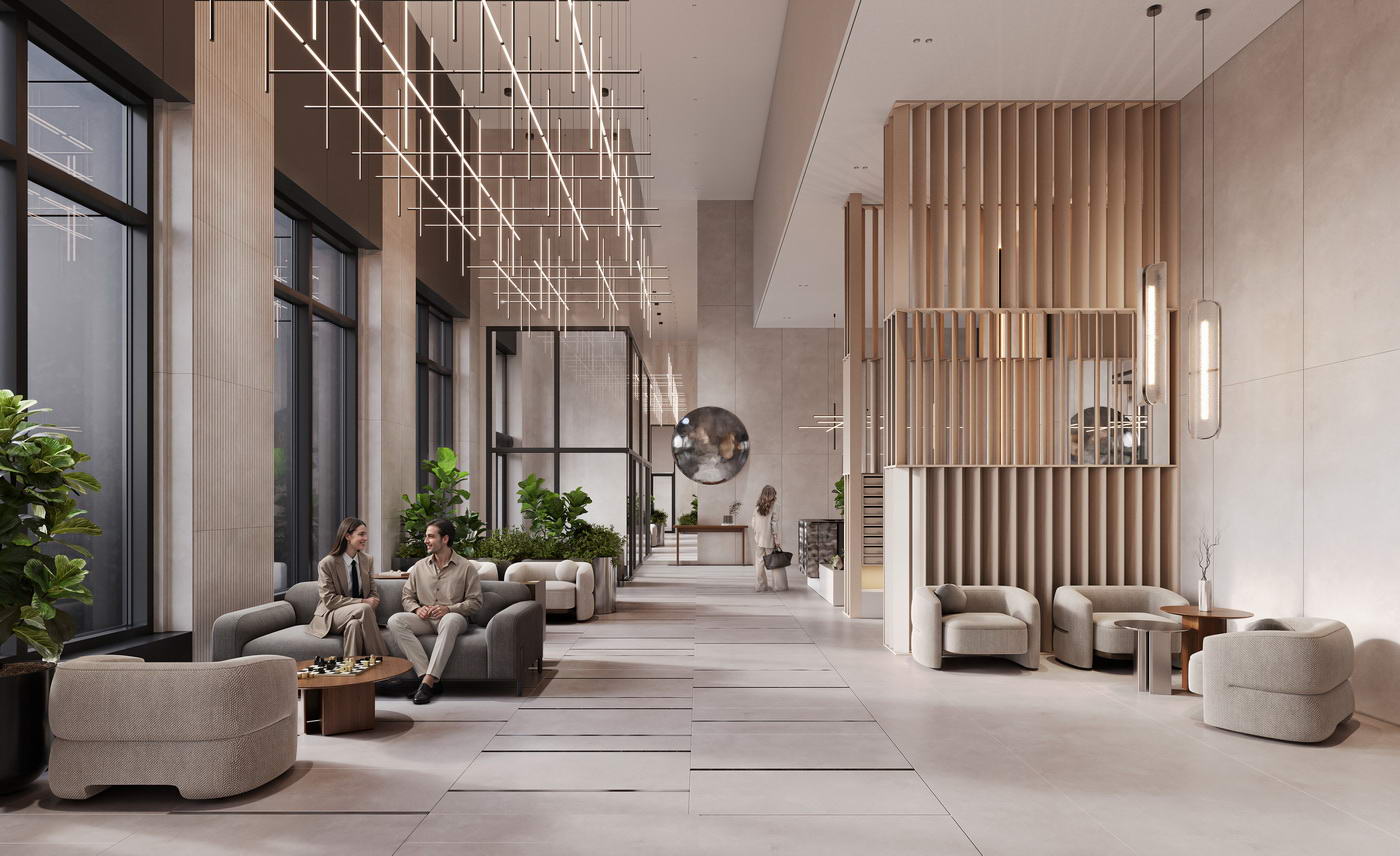 - Двусветные парадные лобби с авторским дизайном и мягкими зонами ожидания